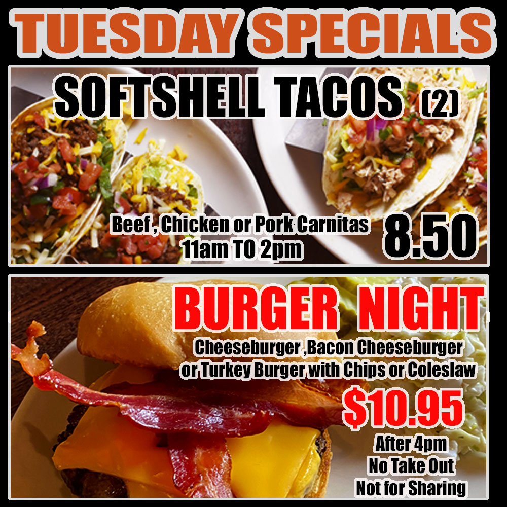 2 Soft Shell Tacos (11AM TO 2PM) Beef, Chicken, Veggie or Pork Carnitas Not For Take Out $8.50 Specials not Valid with Other Coupons, Discounts or Promotions Only Valid During Scheduled Times NOT VALID ON HOLIDAYS Burger Bash 9 (AFTER 4PM) Cheeseburger, Bacon Cheeseburger or Turkey Burger with Chips or Coleslaw $10.95 (No Take Out on Burger Special) Specials not Valid with Other Coupons, Discounts or Promotions Only Valid During Scheduled Times NOT VALID ON HOLIDAYS